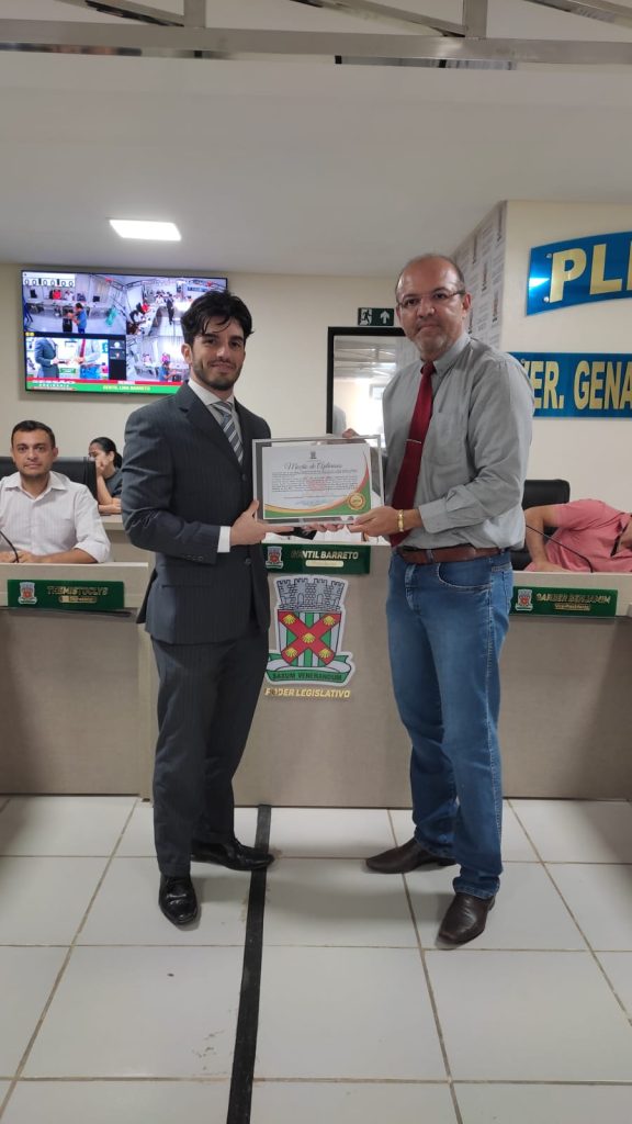 O advogado e procurador do município, Dr Evaldo Filho, foi convidado pelo presidente Dr Gentil para fazer a entrega da Moção de Aplausos representado todos os parlamentares da Casa Clécio Barreto ao homenageando Dr. Stoessel Wanderley.
